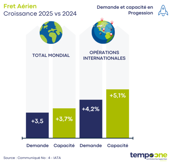La demande mondiale de fret aérien a progressé de 3,4 % en 2025 par rapport à 2024. La capacité a suivi, en hausse de 3,7 %. Sur les opérations internationales, la croissance est encore plus marquée : +4,2 % pour la demande, +5,1 % pour la capacité.